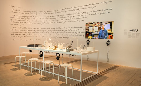 Ruang pembuka pameran menghadirkan suasana hutan yang akrab sekaligus asing, terinspirasi visi Singapura tentang ‘kota dalam taman’ dan memadukan tekstur serta tradisi Asia Tenggara. Lingkungan ini, yang berada di antara masa lalu dan masa depan, menjadi panggung bagi karya-karya yang mengeksplorasi memori, warisan, dan imajinasi. The Space Remembers You karya Syafiq Halid mengajak pengunjung memasuki lanskap sonik dari bunyi tradisional Melayu, dikonfigurasi menjadi instalasi 14-kanal imersif yang mendengarkan dan merespons layaknya organisme hidup. Di sampingnya, Spiritual Spaceships karya Torlarp Larpjaroensook mengubah benda sehari-hari menjadi patung mirip pesawat ruang angkasa, menunjukkan bahwa benda paling biasa pun bisa menjadi wadah masa depan.